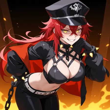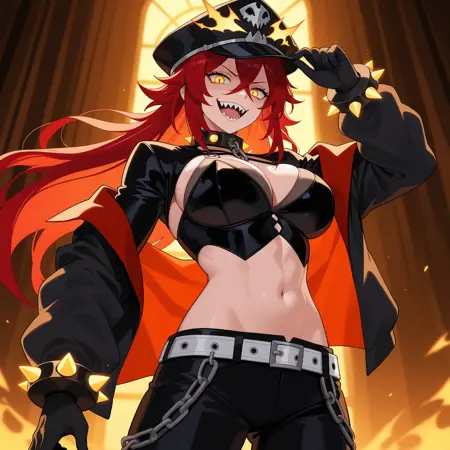 CaterinaHSR, red hair, long hair, yellow eyes, large breasts, toned female, black crop top, shrug \(clothing\), black jacket, open jacket, black pants, white belt, black hat, spiked collar, chain, spiked bracelet, gloves,