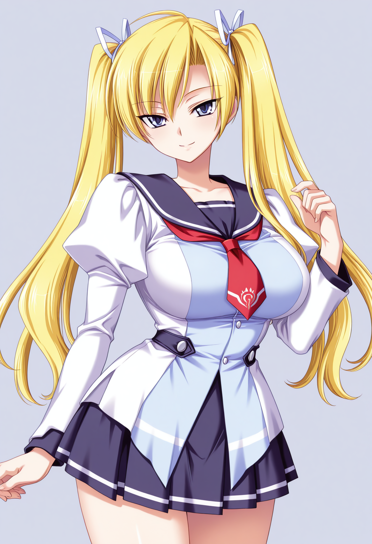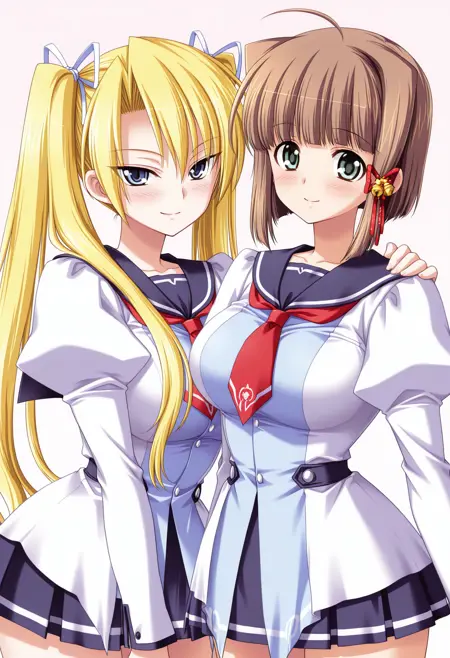 의상: 흰색 세라후쿠, 빨간 넥타이, 파란 바다복 칼라, 줄리엣 소매, 긴 소매, 접힌 스커트, 파란 스커트,