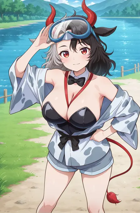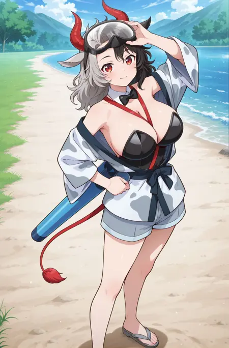 ushizaki urumi, 1girl, solo, red eyes, two-tone hair, black hair, grey hair, long hair, cow ears, cow horns, red horns, cow tail, ushizaki urumi \(bunny sanzu river guard\), alternate costume, snorkel mask, black bowtie, animal print, open kimono, grey kimono, cleavage, leotard under clothes, black leotard, grey shorts, black belt, grey sandals,