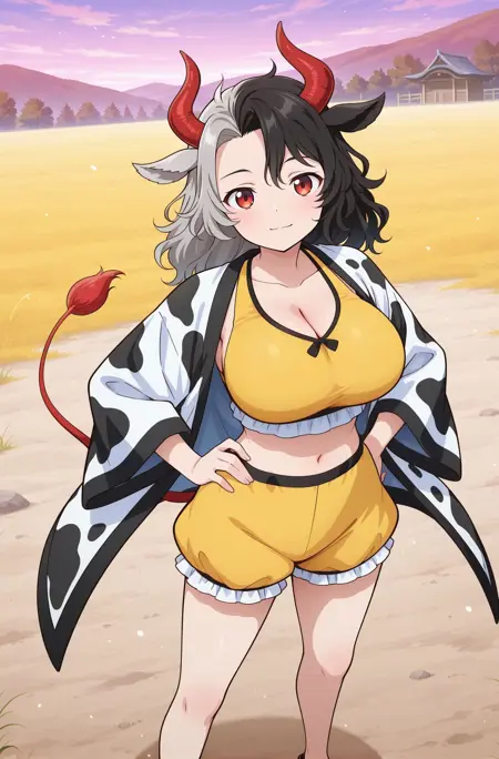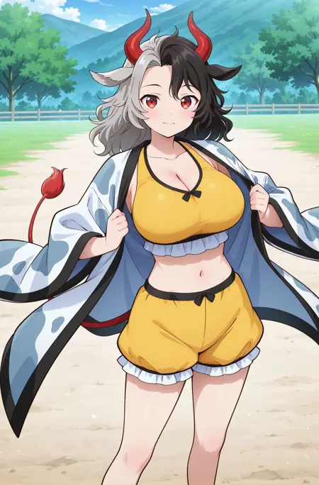 japanese clothes, cow print, crop top, yellow top, cleavage, haori, wide sleeves, navel, yellow shorts, frilled shorts, sandals,
