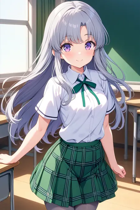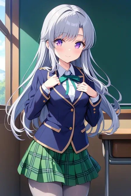 small breasts, blue jacket, blazer, collared shirt, white shirt, green ribbon, neck ribbon, green skirt, plaid skirt, grey pantyhose, school uniform