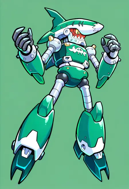 JohnnySonic, 1boy, robotic shark-themed, green and white mechanical components, green body, sharp fins, exposed metallic limbs, intricate robotic details, mechanical jaw, black eyes, yellow sclera, claw-like fingers, fin-like features, mecha,