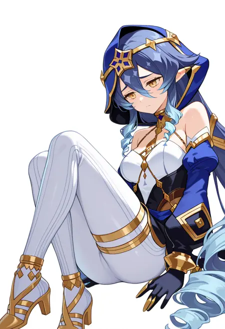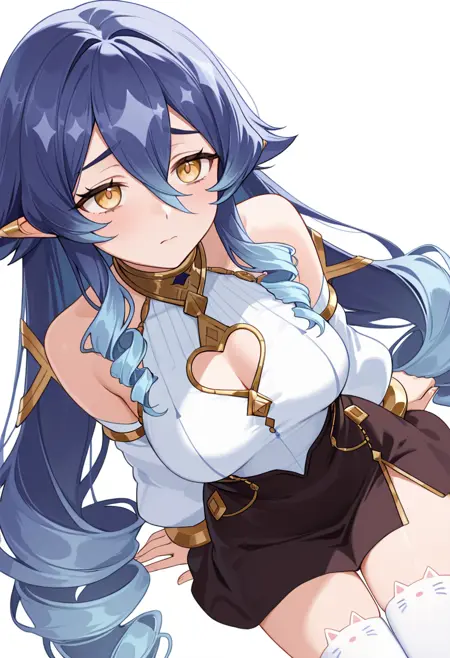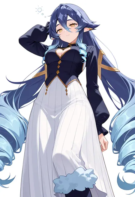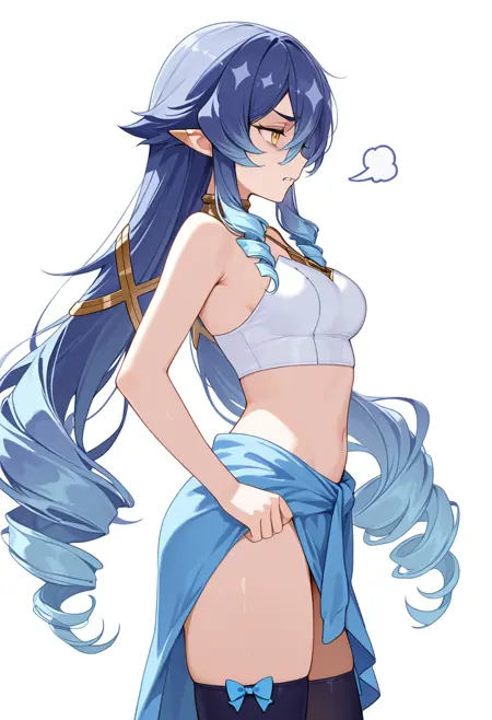 layla_cnr, 1girl, blue hair,very long hair, twin drills, drill locks, pointy ears, yellow eyes, hair between eyes, sidelocks,medium breasts,