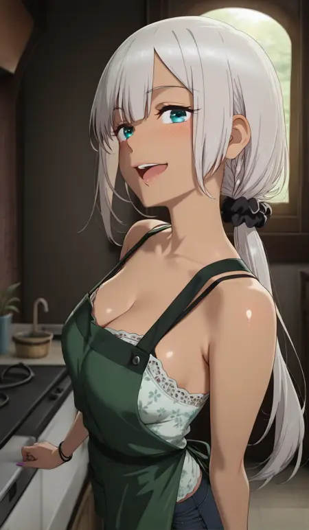 은색 머리, 긴 머리, 곧은 앞머리, 땋은 머리, 청록색 눈