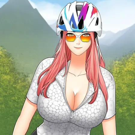 1. ((sexy short-sleeves black cycling top, obscene cleavage, huge cleavage, sexy black cycling shorts, )) white-framed cycling sunglasses with colorful lens, white cycling shoes, cropped black cycling gloves, oversized grey hoodie, black cycling shoes with white edge, red cycling helmet,