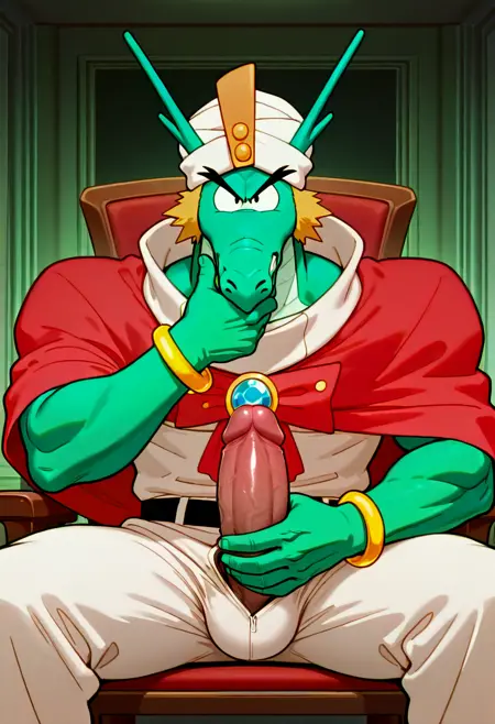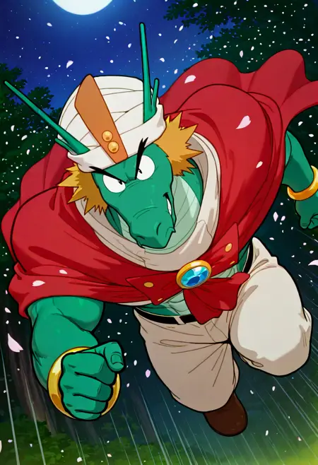 Drago,Dragon boy,Dragon beard,Green skin,White turban,Red cape,Yellow bracelet,Gemstone decoration on chest,Loose white clothes,Loose white pants,