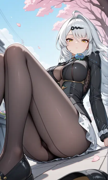 黑色手套, 黑色短裤, 黑色过膝袜, 臂环, 乳房暴露, 有领衬衫, 无指手套, 手套, 高腰短裤, 夹克, 露出服装, 开襟夹克, 橙色夹克, 衬衫, 衬衫塞入, 短裤, 单侧过膝袜, 单侧分离袖子, 大腿带, 白色衬衫, 两乳之间, 雀斑, 乳房上的雀斑