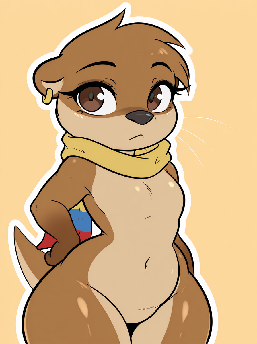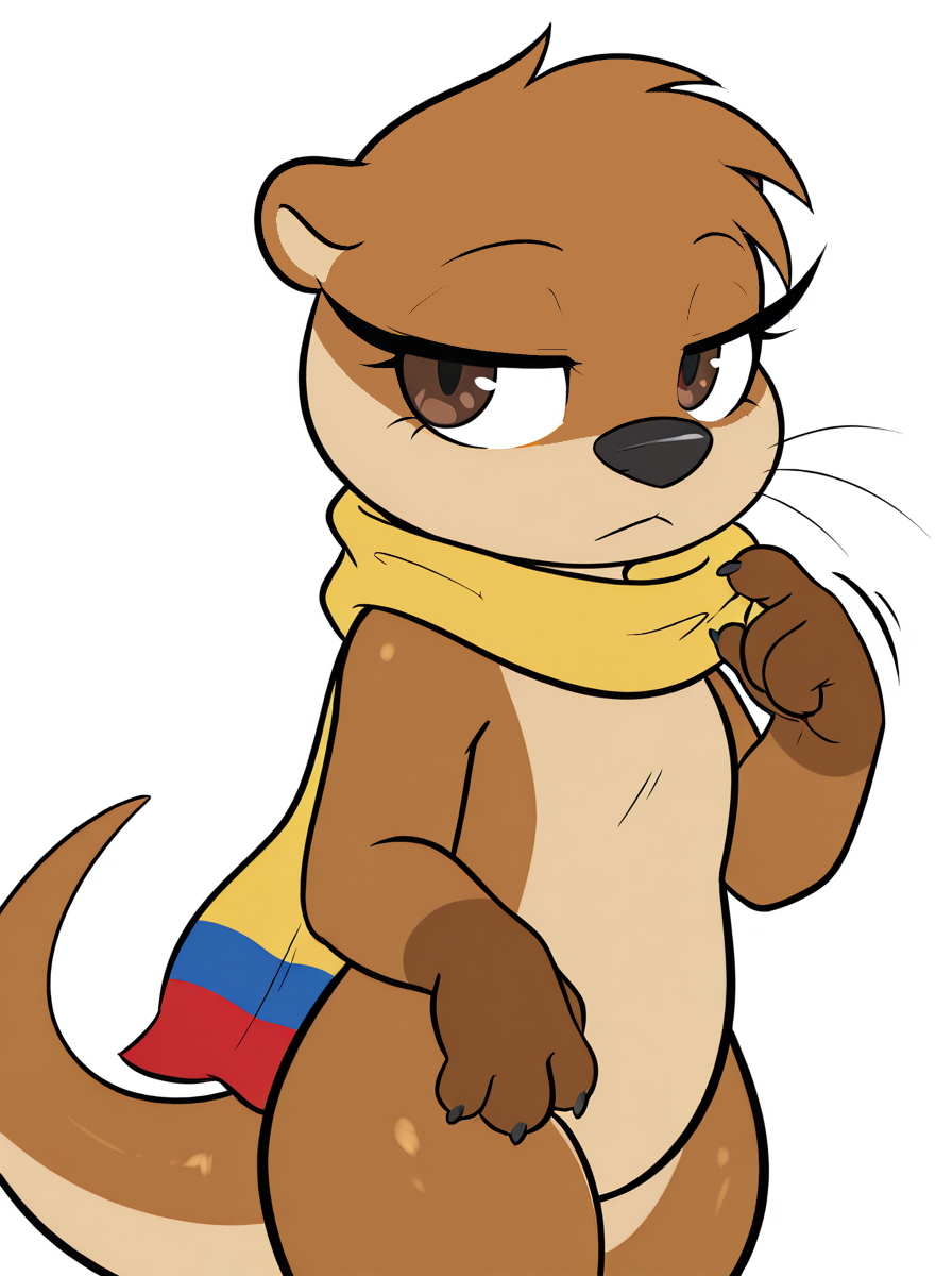 anthro, female, otter, light brown body, yellow scarf, colombian flag scarf, brown eyes, long eyelashes