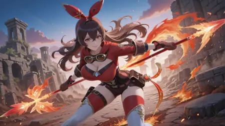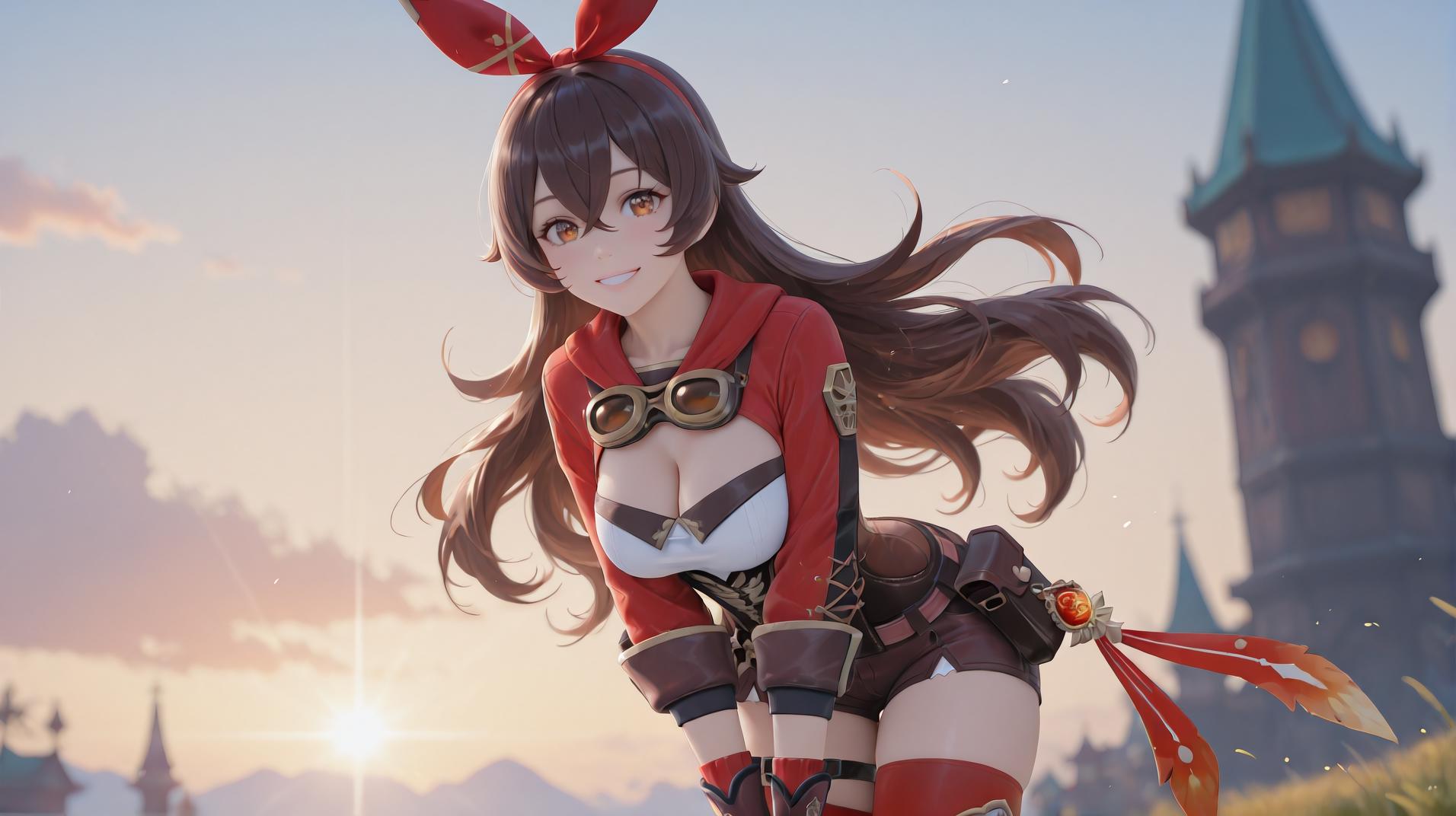 AmberBlender,1girl,amber \(genshin impact\),solo,long hair,thighhighs,goggles around neck,gloves,goggles,shorts,brown gloves,brown hair,brown shorts,thigh boots,boots,hair between eyes,shrug \(clothing\),long sleeves,pouch,short shorts,belt,red thighhighs,vision \(genshin impact\),white footwear,crossed bangs,tachi-e,brown eyes,hair ribbon,ribbon,thigh strap,sidelocks,red ribbon,red hairband,orange eyes,two-tone gloves,belt pouch,hairband,