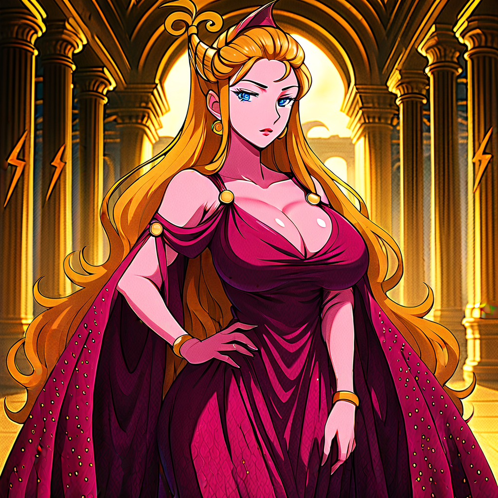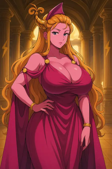 它能帮助你绘制《赫拉克勒斯》中的迪士尼女神赫拉。外观:高挑、端庄,深邃的蓝色眼睛,金色飘逸的长发,完美的姿态,威严的优雅