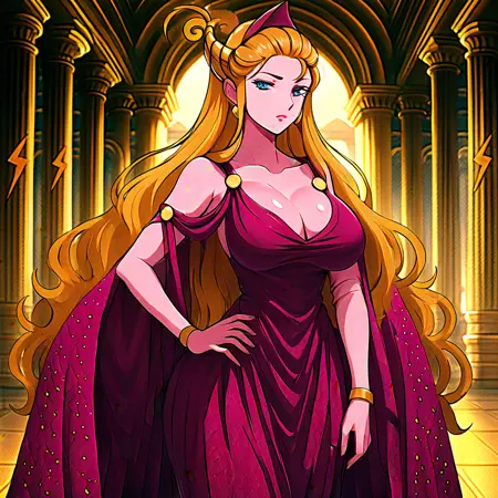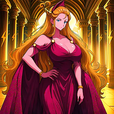Clothes: Royal magenta gown with gold accents, dramatic cape, adorned with regal insignia and lightning motifs