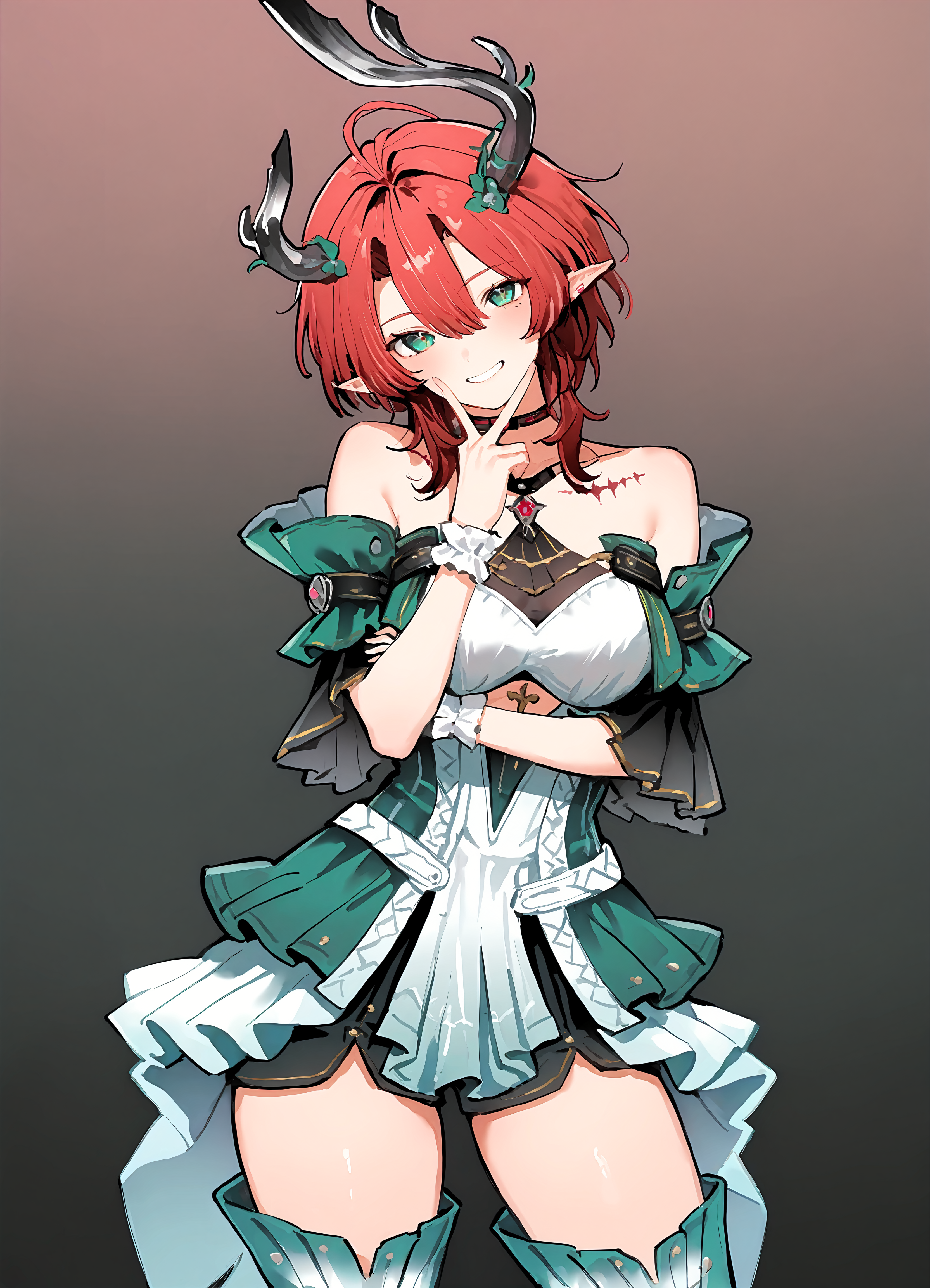 - ciaccona, horns, choker, chest tattoo, detached sleeves, wrist cuffs, thigh boots