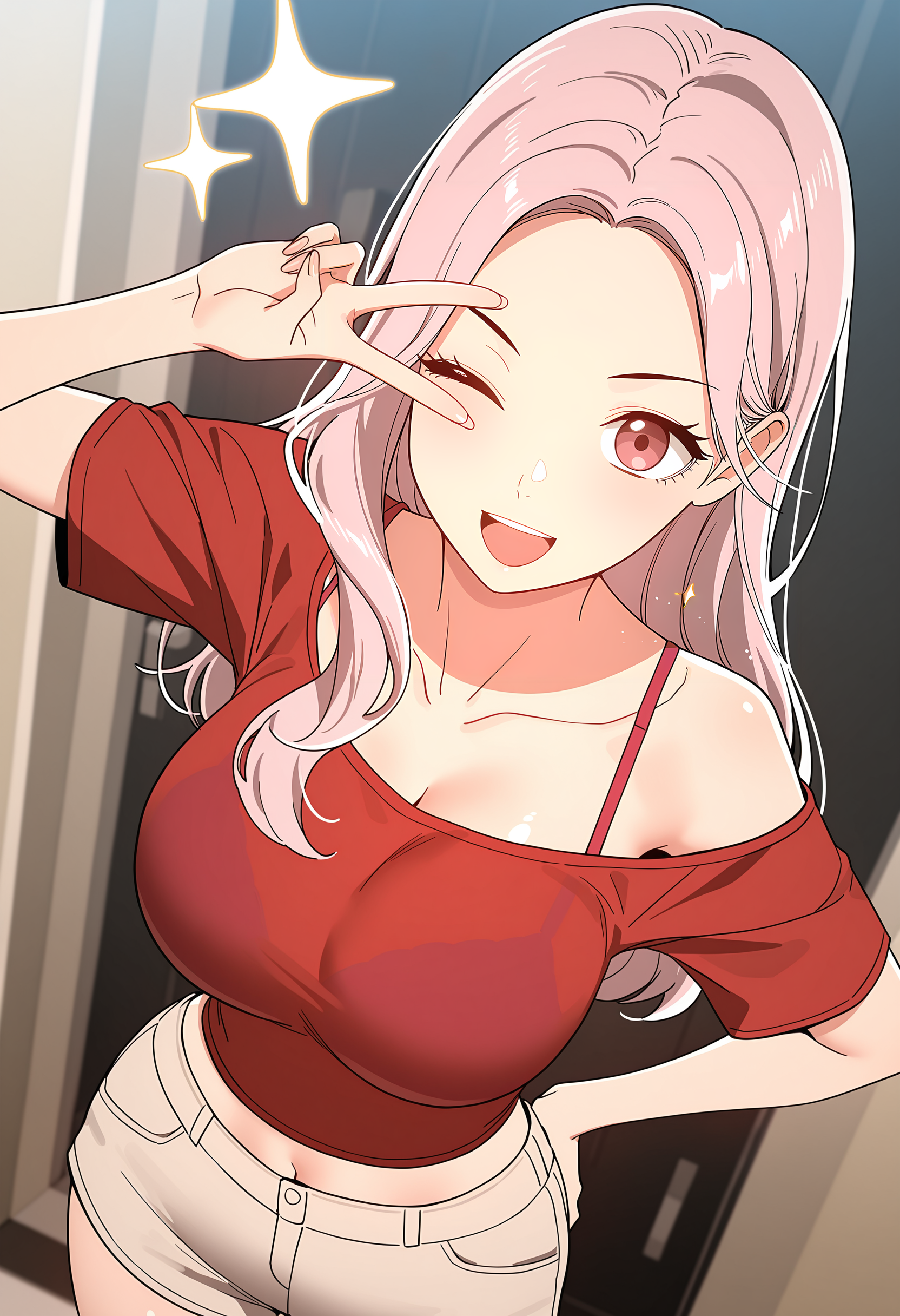 ch4eeun、ピンクの目、ピンクの髪、長い髪、額、大きな胸