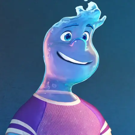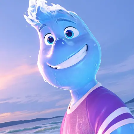 Wade, wet, water, 1boy, solo, completely made out of translucent blue water, waves that resemble hair, eyebrows are a cerulean-blue color, small round nose, blue eyes, purple T-shirt with white trim around the collar bottom and darker-colored sleeves, sleeves have white stripe on them, casual business attire, pale yellow polo shirt with thin wavy white stripes, necktie that sports a light purple and light blue gradient,