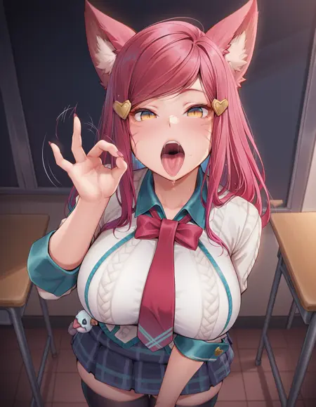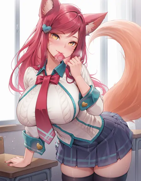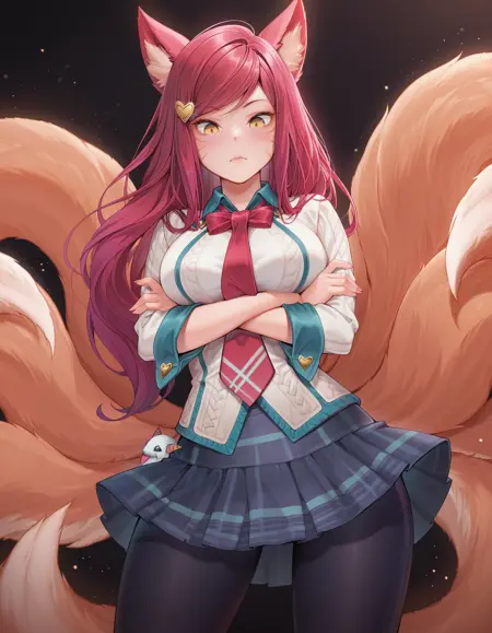 yellow eyes, red hair, collared shirt, necktie, skirt
