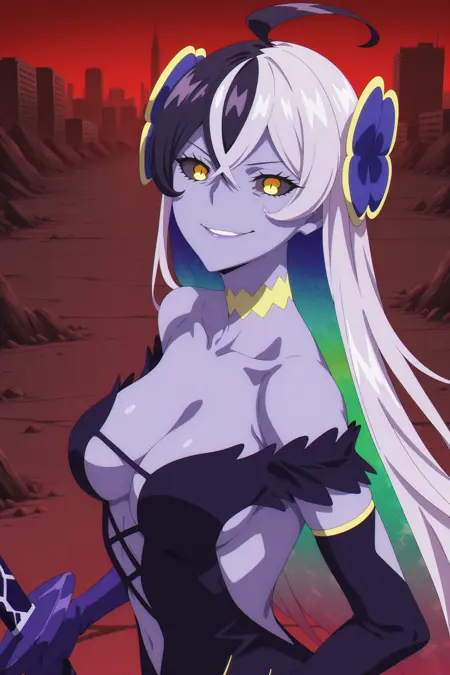 jigoku no orufe, very long hair, multicolored hair, grey hair, purple hair, colored inner hair, crossed bangs, ahoge, hair ornament, yellow eyes, slit pupils, grey sclera, purple skin, choker, off-shoulder dress, purple dress, jewelry, elbow gloves, asymmetrical gloves, cross-laced cutout, plunging neckline, anklet, purple footwear, high heels