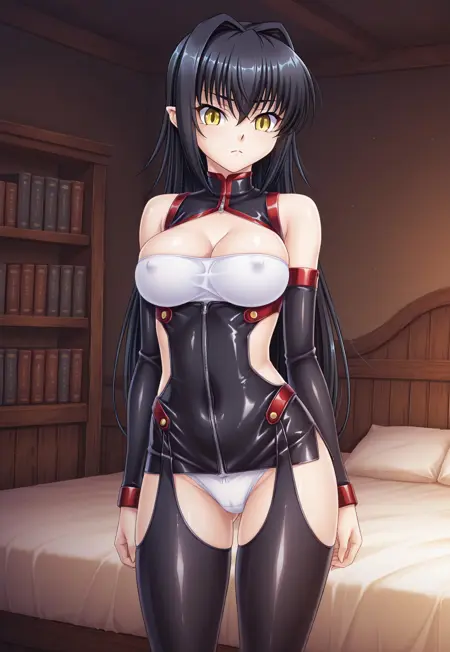 タグ: 1girl、クルビー、ツヤツヤの肌、ツヤツヤの服、アンローゼ・ヴァイドラ\(新月\)、黄色い目、ツリメ目、中程度の胸、非常に長い髪、黒髪、髪が顔を覆う、目と目の間の髪、とがった耳