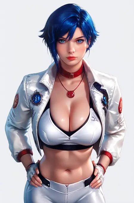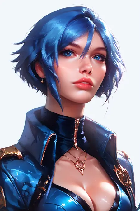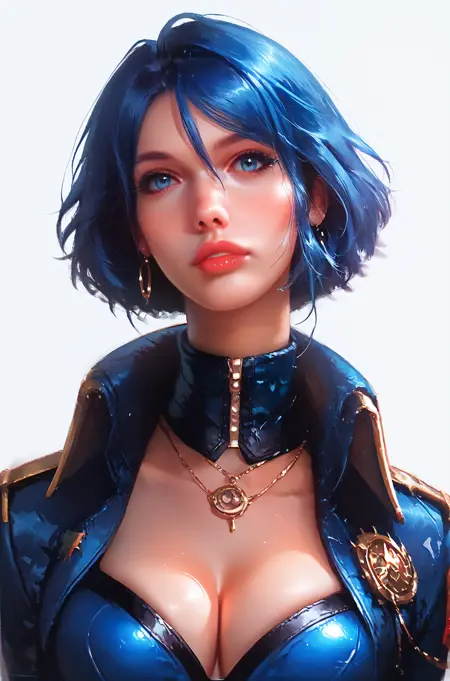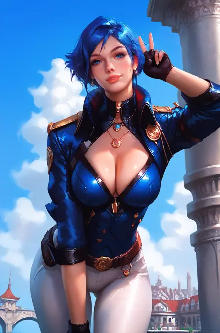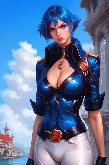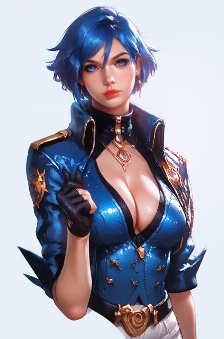 , 1girl, solo, short_hair, blue_hair, purple_hair, multicolored_hair, hair_between_eyes, looking_at_viewer, blue_eyes, parted_lips, necklace, high_collar, jacket, blue_jacket, breasts, large_breasts, cleavage clothing_cutout, cleavage_cutout, tight_clothes, gloves, black_gloves, belt, pants, white_pants, tight_pants, boots, black_footwear