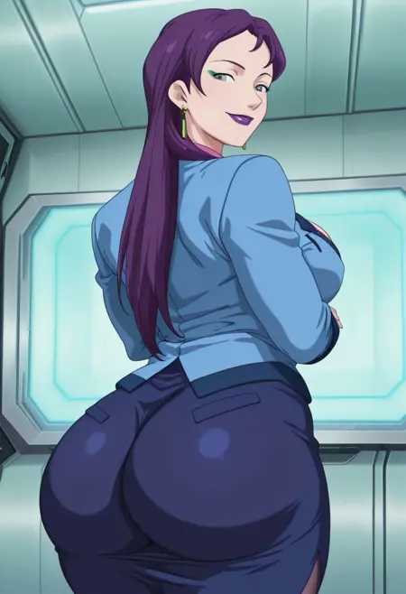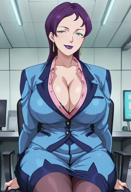 1girl, sarah, mature woman, purple hair, long hair, gray eyes, green eye shadow, blue suit, blue skirt, pink button down shirt, big breasts, milf, uniform, jewelry, long earrings, purple lipstick, pantyhose, high heels