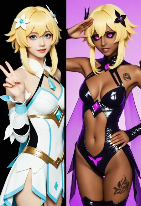 第二行:corruption,corruption costume,角色名,动作,(发色、具体服装类型等),优化词