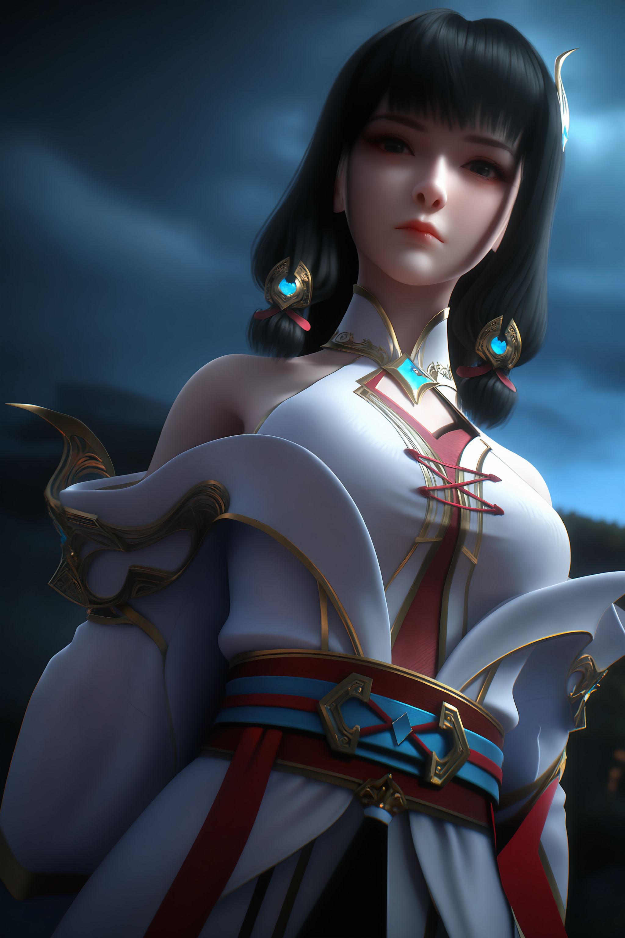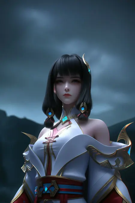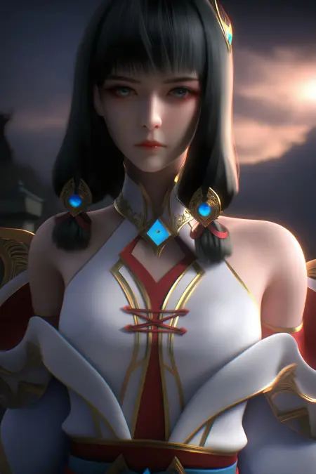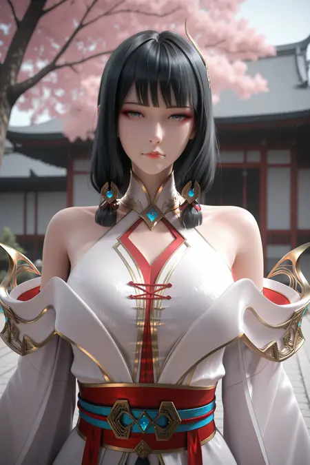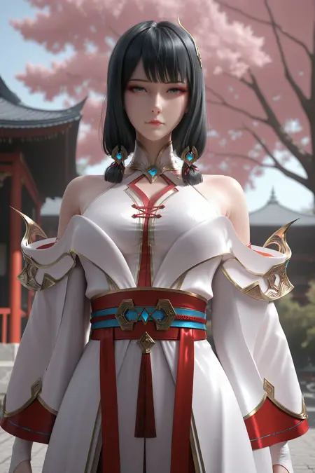 1girl, solo, black hair, hair ornament, bare shoulders, sash, closed mouth,