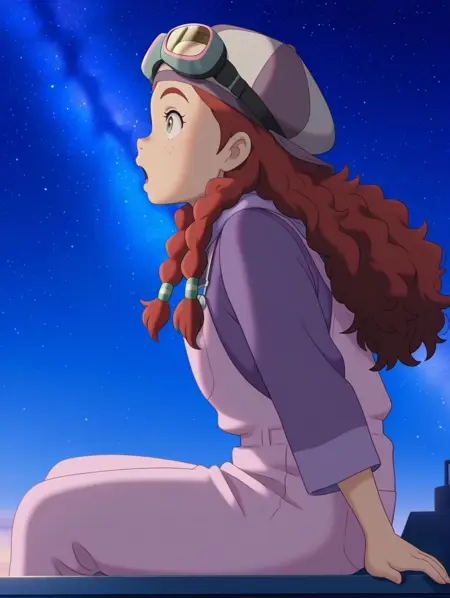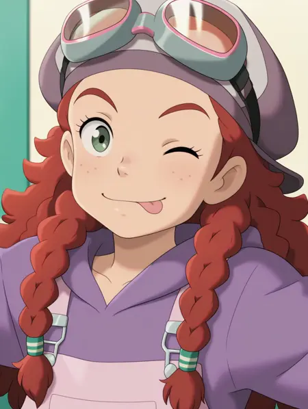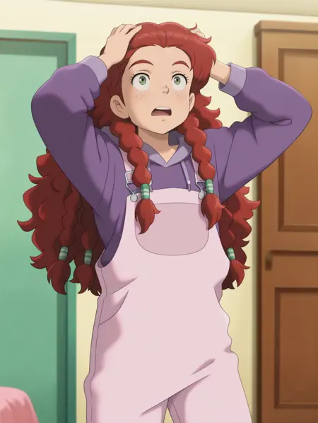 艾米丽,绿色眼睛,红发,长发,编发,绿色发圈,雀斑,浓眉,1个女孩,青少年,官方风格,动漫截图