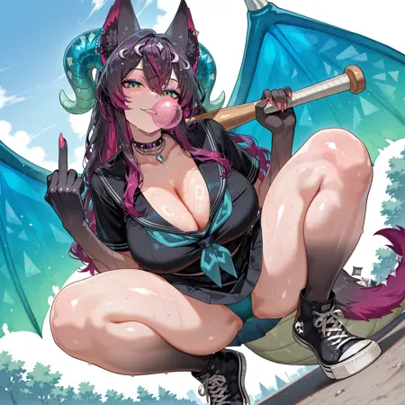 AmalgamyteVT, 1girl, solo, virtual youtuber, furred dragon tail, colored extremities, black hands, horns, animal ears, animal ear fluff, multicolored hair, dragon wings, long hair, black hair, gradient hair, purple hair, black feet, green eyes, light blue eyeshadow, makeup, hair between eyes, sharp fingernails, bangs, pink nails, light blue eyeshadow, grey lips,