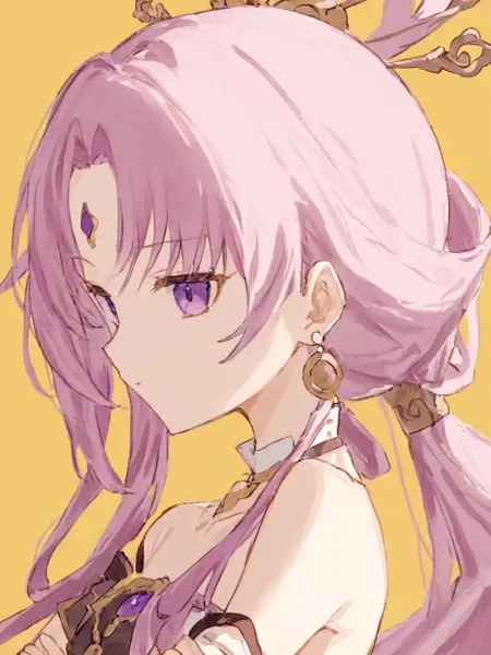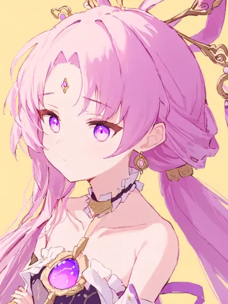 触发词:pink_hair,hair_rings,yellow_eyes,long_hair,hair_ornament,full body,off-shoulder_shirt,pink_nails,