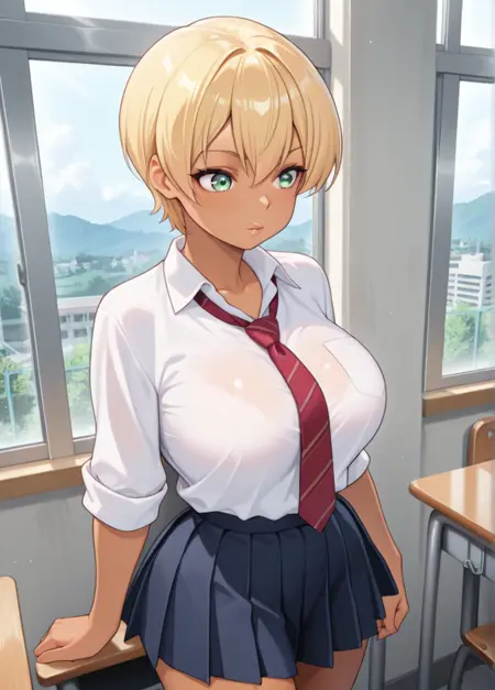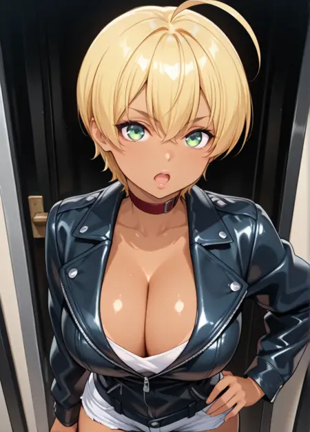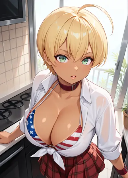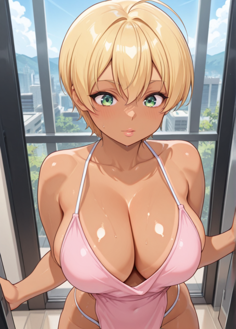mitoxd, short hair, blonde hair, green eyes, pink lips, tan lines, tanned skin, 1girl,