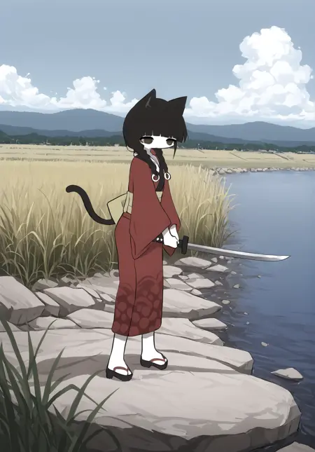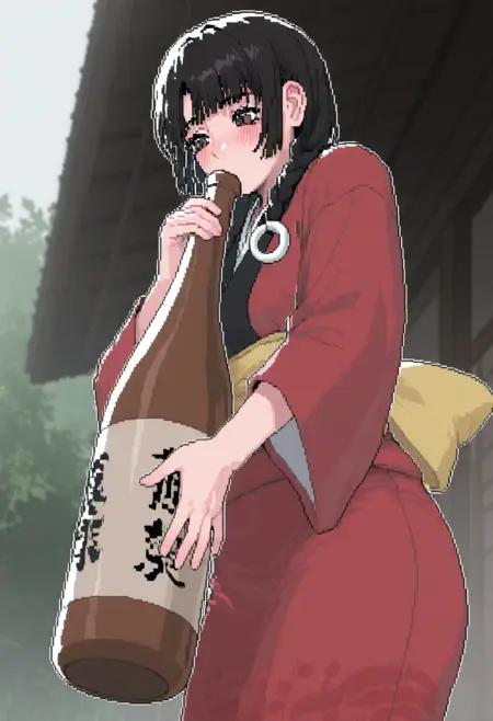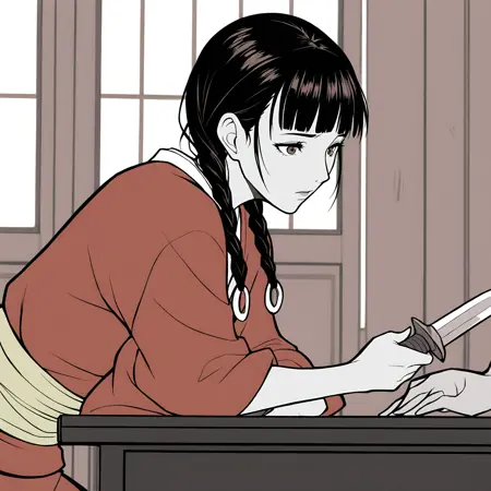 a5an0_r1n, brown eyes, black hair, blunt bangs, hair over shoulder, twin braids, rings on twin braids, bangs, red kimono, japanese clothes, yellow obi, sandals,
