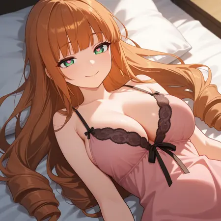 Character: 1girl, long hair, green eyes, orange brown hair, low drills, blunt bangs, breasts,