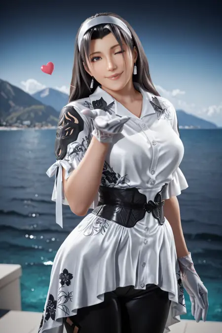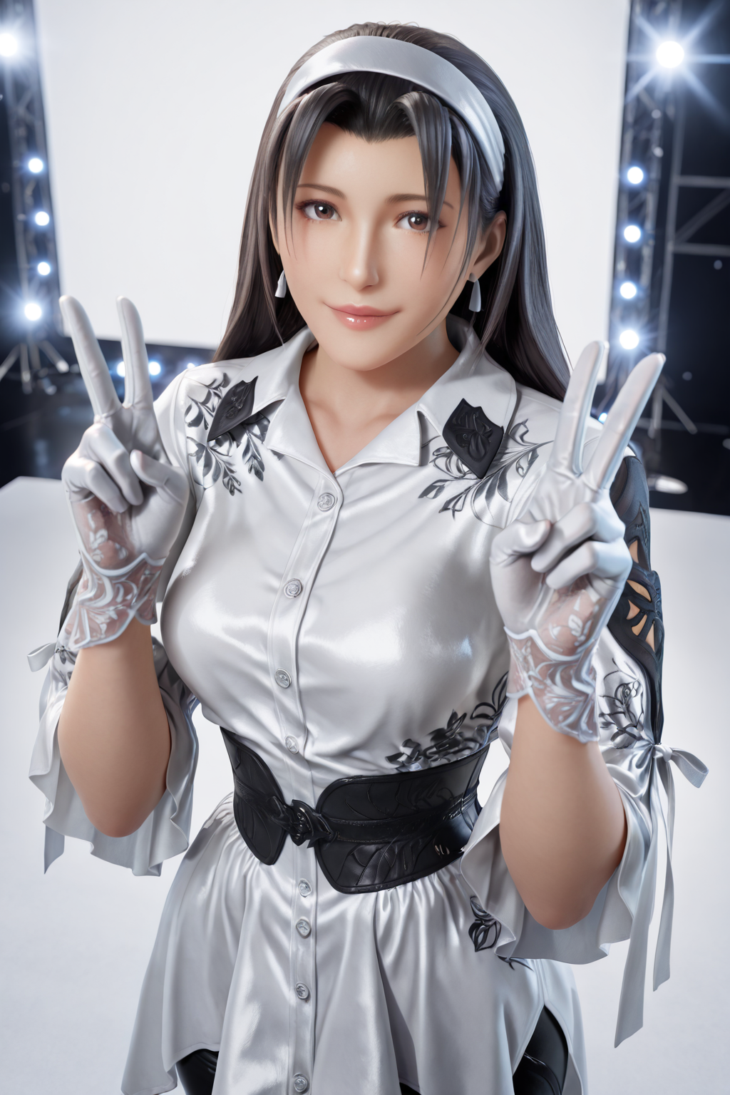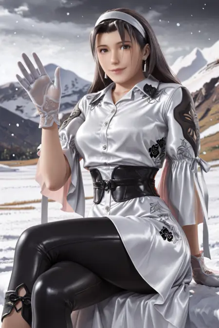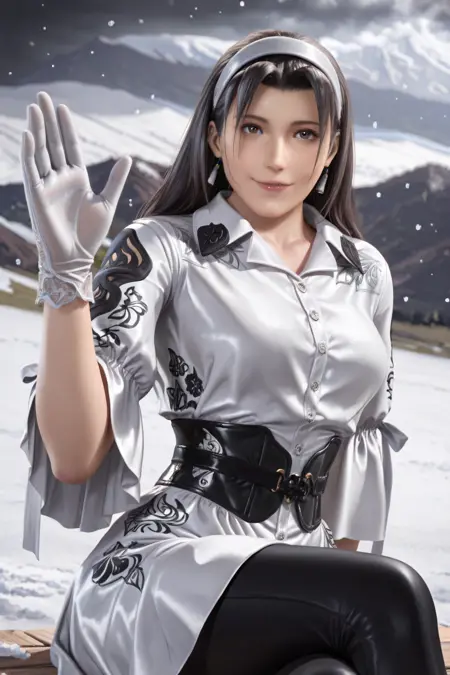 Jun Kazama, long hair, black hair, brown eyes, earrings, hairband, corset, white gloves, white dress, black pants, floral print, black leggings, shoes, black footwear, white footwear