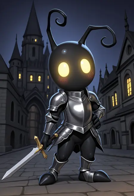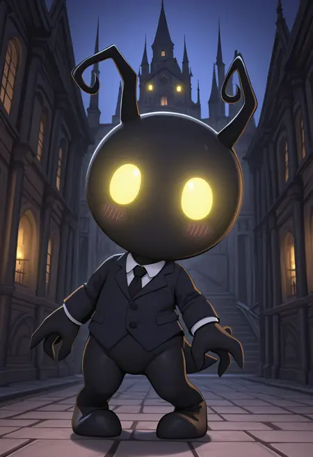 sh4ilf, no mouth, colored skin, black skin, antennae, glowing eyes, yellow eyes