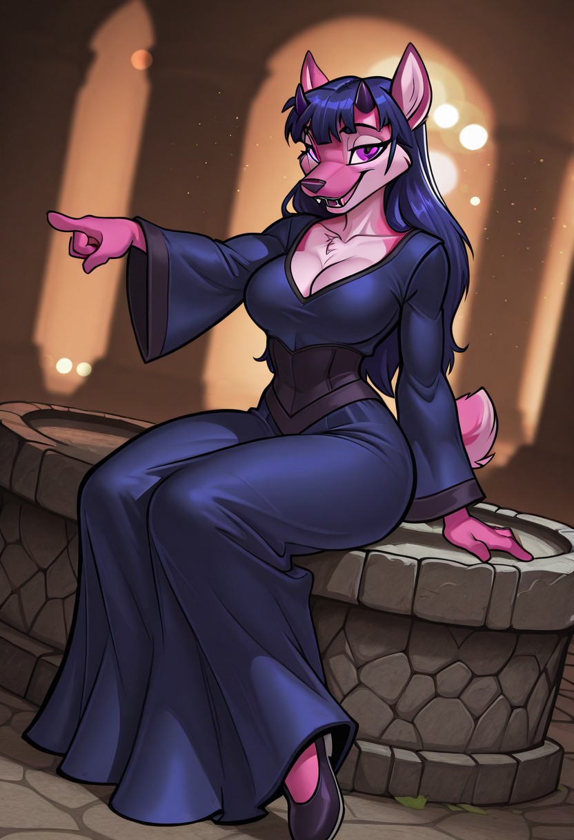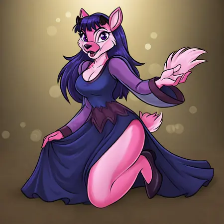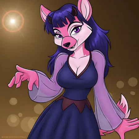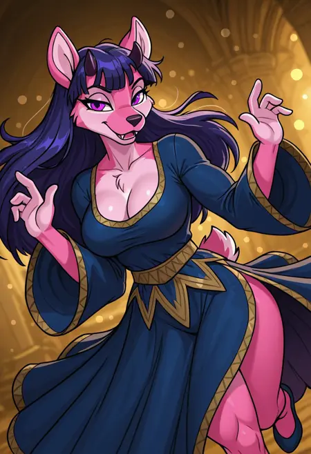 NabileMS,1个女孩,单独,毛茸茸的女性,拟人化,粉红色毛发,彩色皮肤,动物耳朵,长发,蓝色头发,刘海,角,紫色眼睛,吻部,獠牙,大乳房,尾巴,粗大腿,长蓝色连衣裙,裙装装饰,宽大长袖,鞋子,乳沟,