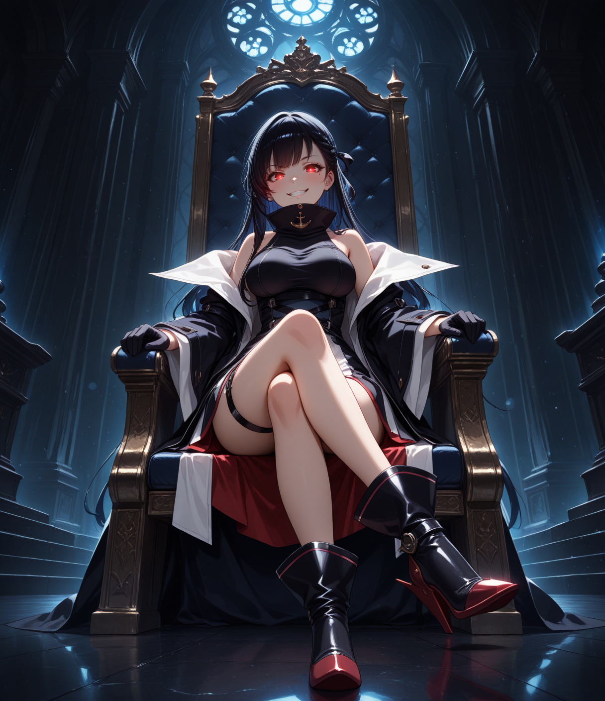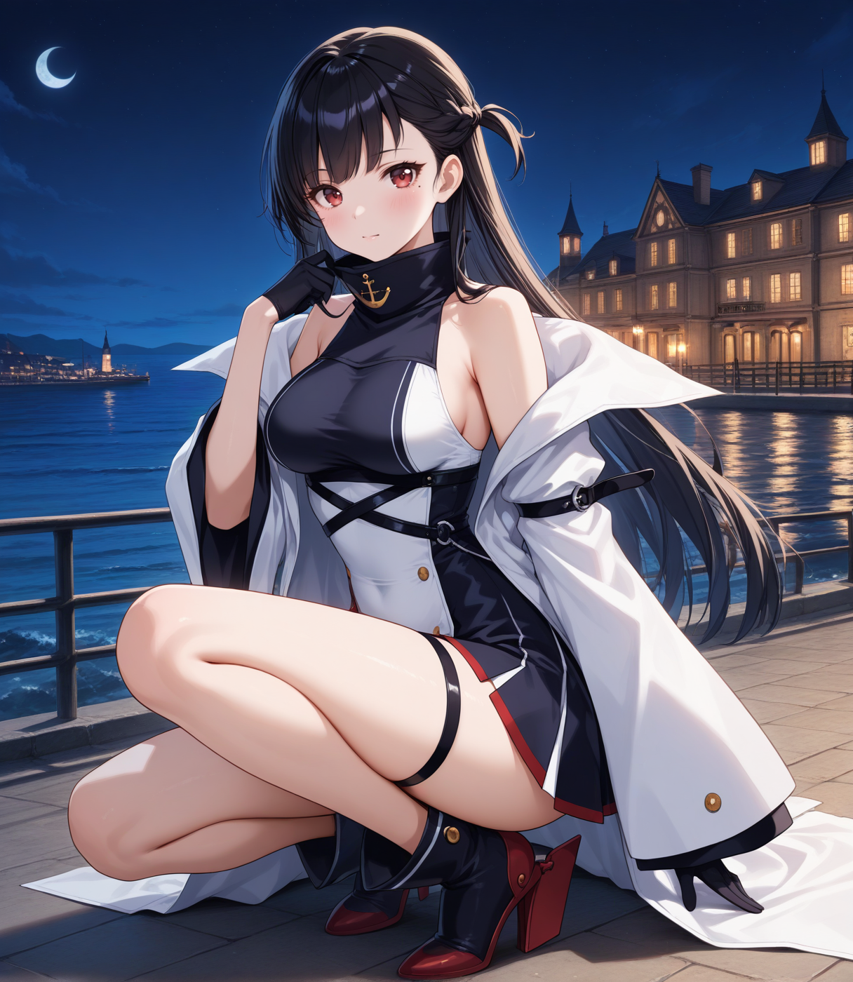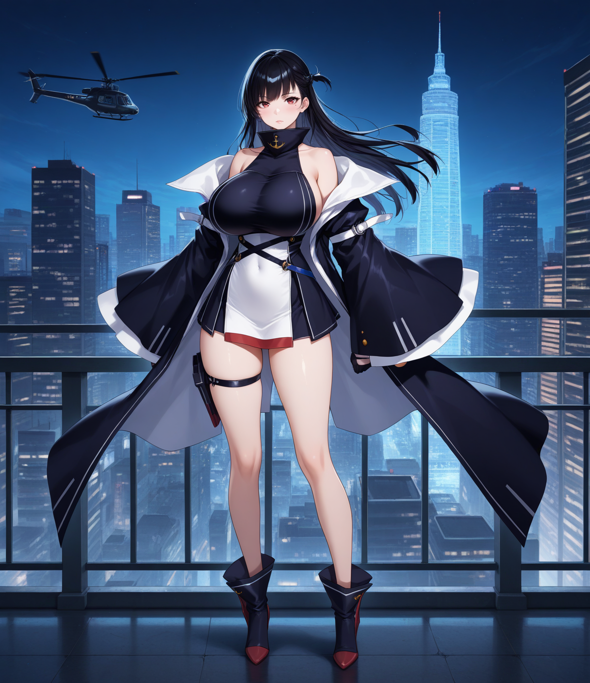 无袖连衣裙,开衩外套,长外套,双色连衣裙,蓝白连衣裙,高领,大腿绑带,红色镶边,不对称设计,多条腰带,露肩,落肩,宽袖,黑色半指手套,黑色踝靴,未来感靴子,锚形图案,舵形鞋履,