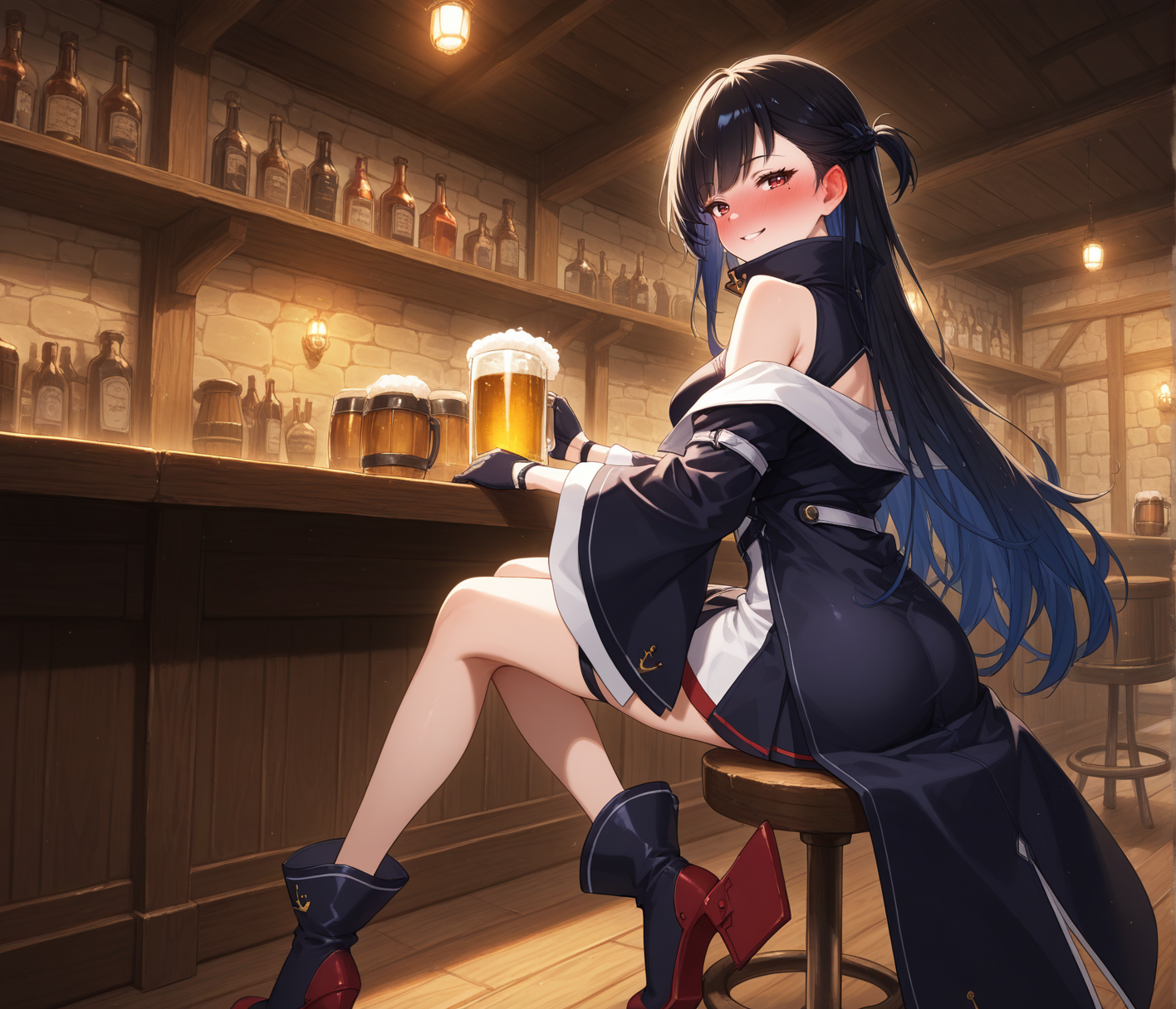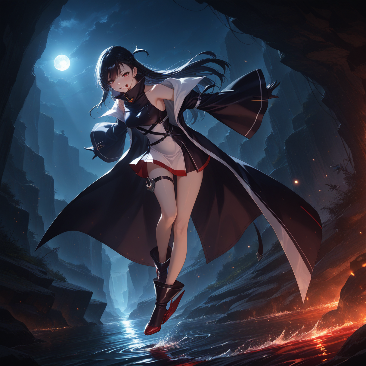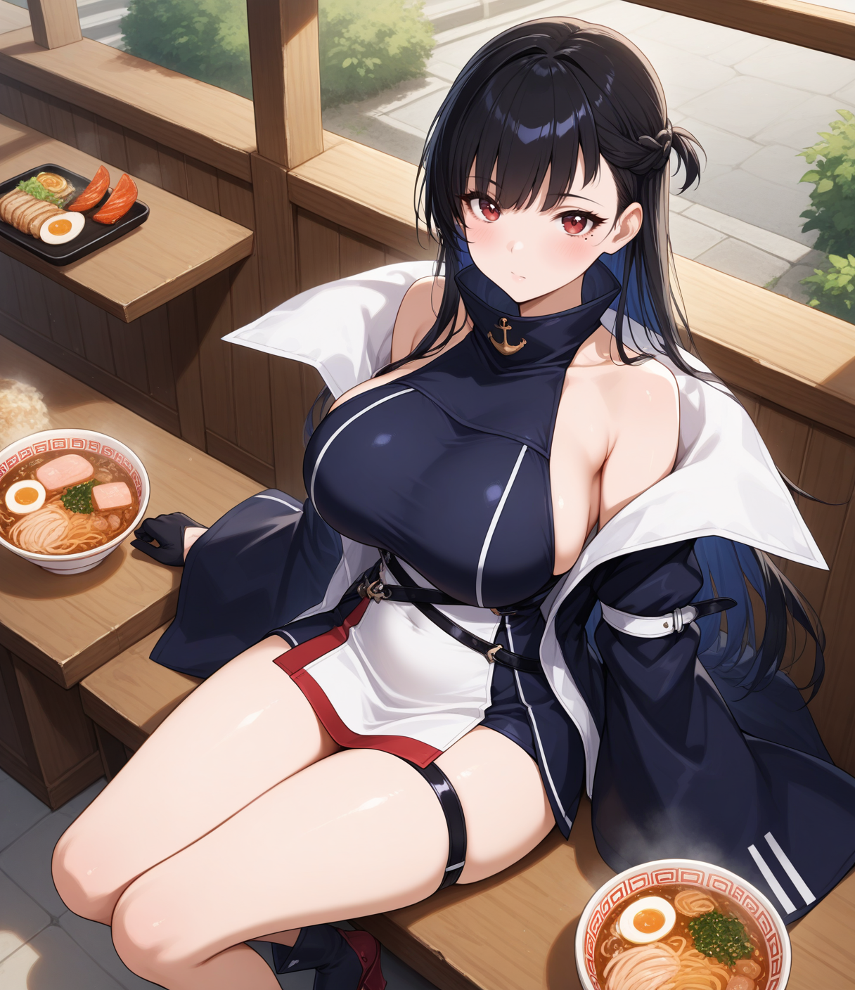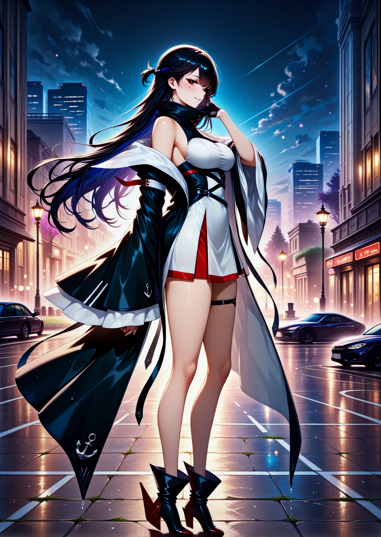 无袖连衣裙,开衩外套,长外套,双色连衣裙,蓝白连衣裙,高领,大腿绑带,红色镶边,不对称设计,多条腰带,露肩,落肩,宽袖,黑色半指手套,黑色踝靴,未来感靴子,锚形图案,舵形鞋履,