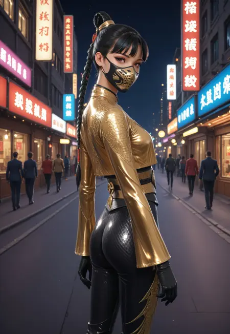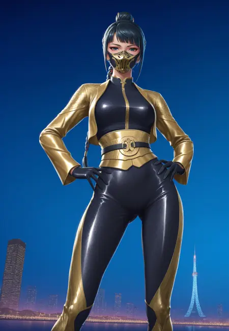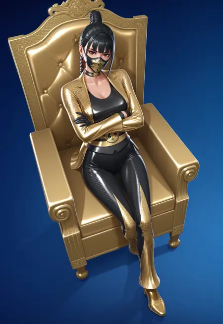 LadyOfCranes, black hair, single braid, single hair bun, mouth mask, gold jacket, long sleeves, black gloves, belly belt, black and gold pants, gold footwear, shiny clothes,