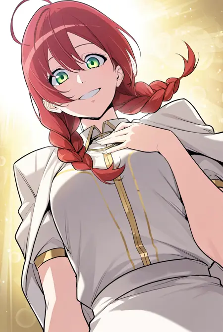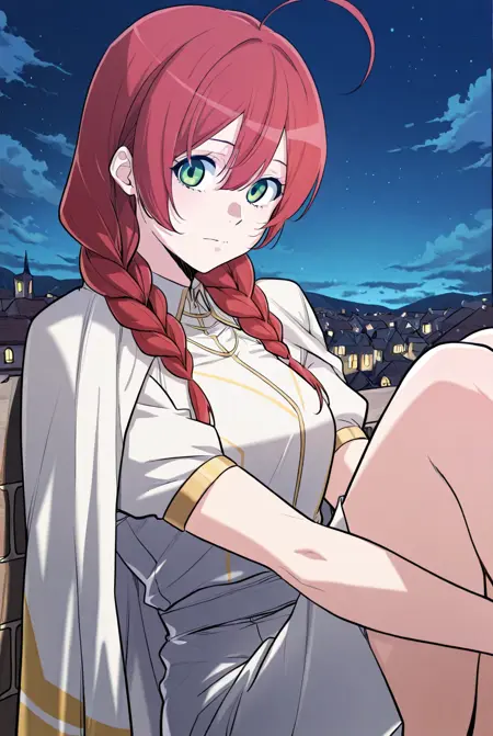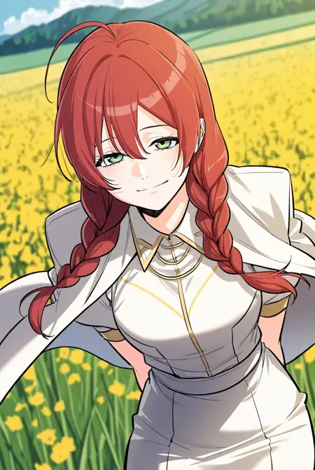 1girl, solo, red hair, twin braids, ahoge, hair between eyes, green eyes,