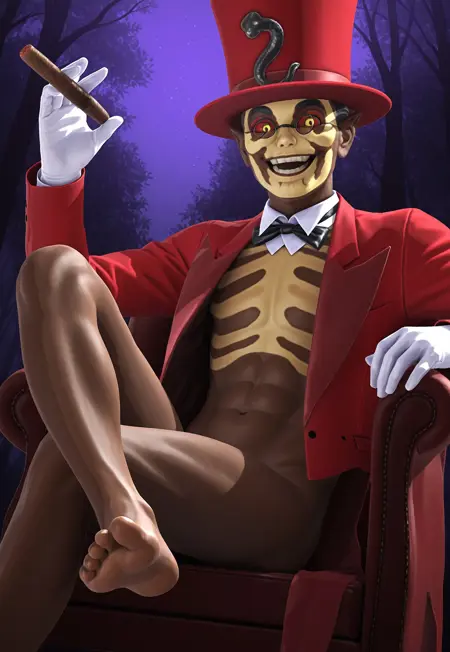 深色皮肤,黄眼睛,红色巩膜,燕尾服,红色燕尾服,帽子,红色帽子,高礼帽,手套,白色手套,黑色蝴蝶结,白色领子,分离式领子,骨骼纹身,骷髅脸绘,淡黄色脸绘,圆形眼镜,无镜片眼镜,白色领子,白色手套,无下身,尖耳,赤脚,