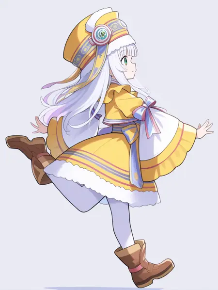 プロンプトの例: riria,白い髪,緑の目,長い髪,帽子,ドレス,レース縁,広い袖,長い袖,靴,リボン,