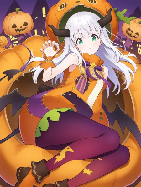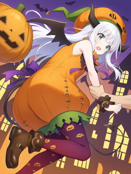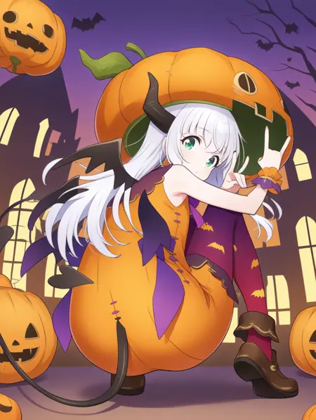 プロンプト例: kabotya,白髪,緑の目,長い髪,角,ハロウィン,ハロウィン衣装,かぼちゃ,帽子,ノースリーブ,手首の cuffs,翼,リボン,デーモンの尾,赤い脚衣,紫の脚衣,靴,プリント脚衣,