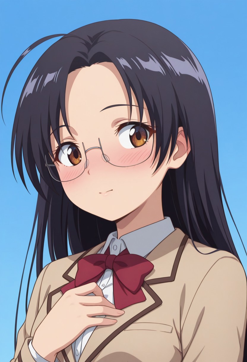 茶色の目、黒髪、小さな胸、白い肌