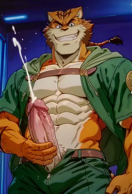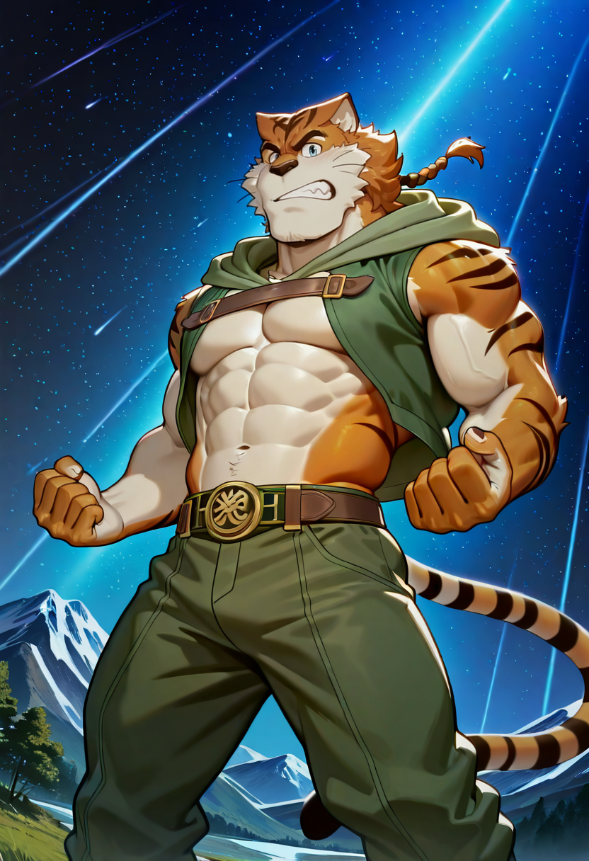 gao,Tiger boy,Blue eyes,Green hooded jacket,Gemstone decoration on left shoulder,Two brown belts on chest,Green loose shirt,Green loose pants,Black decorative belt,Braided ponytail that looks like a tiger tail,