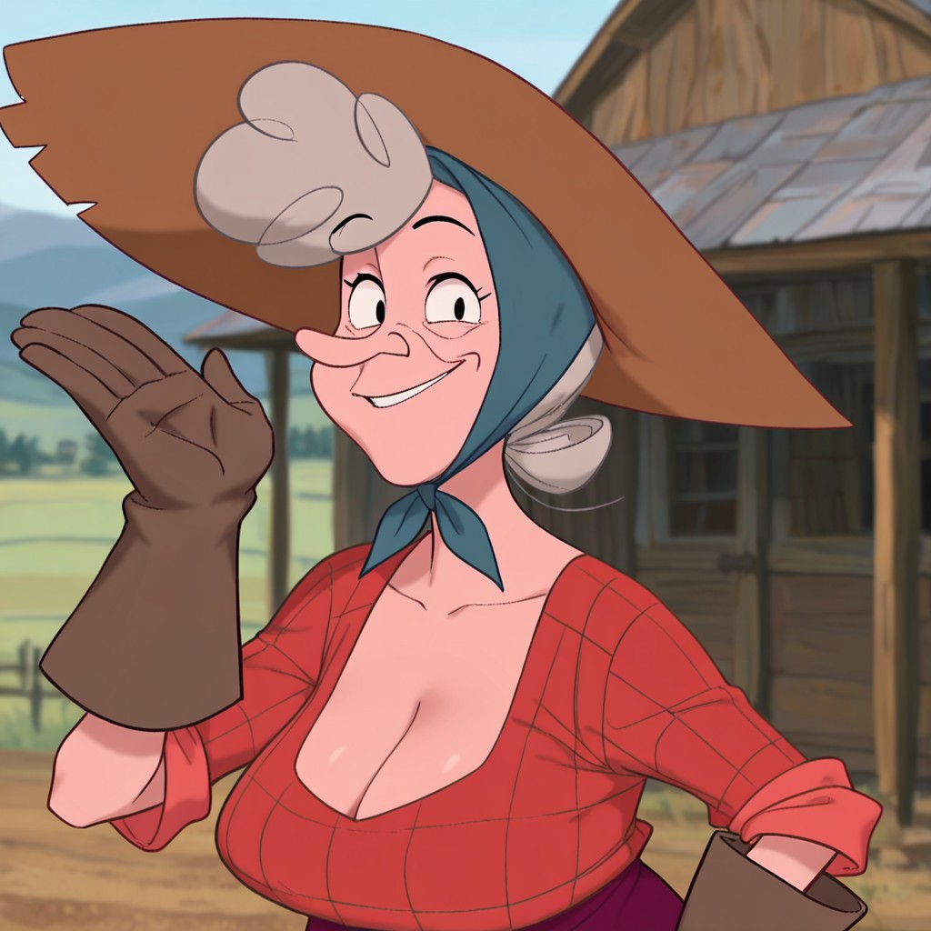 PearlHOTR, overweight female, elderly female, red shirt, dark red skirt, blue headscarf, hat, brown glove, black shoes, grey hair in a bun, black eyebrows, black eyes