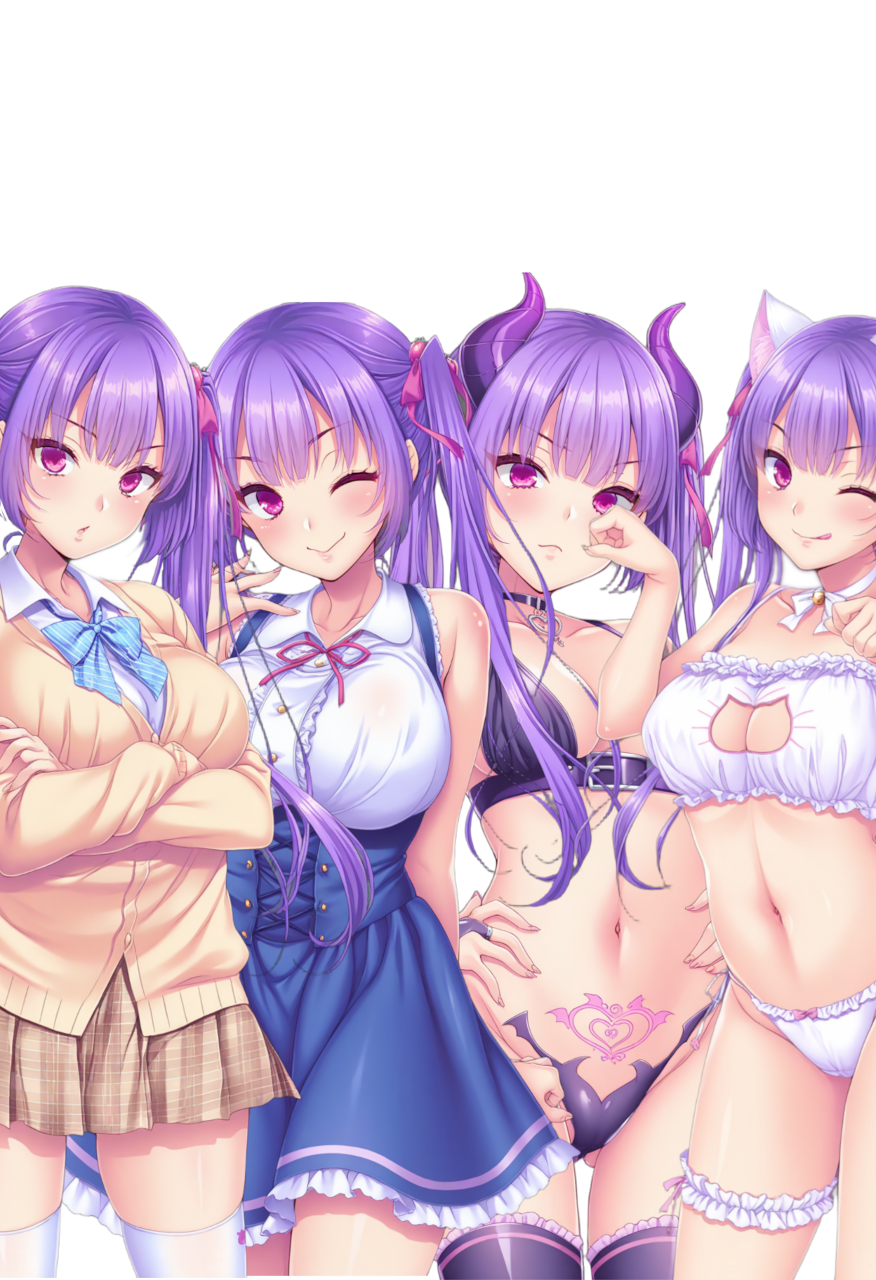 Clothing: heart choker, purple bikini, purple belt, purple thighhighs, bridal gauntlets