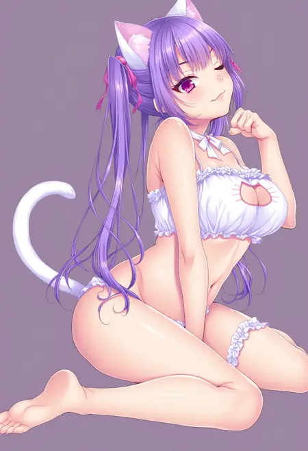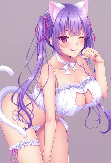トリガーワード: c-mitsu、ピンクの目、紫の髪、ツインテール、髪飾り、髪リボン、猫の耳、猫のしっぽ、