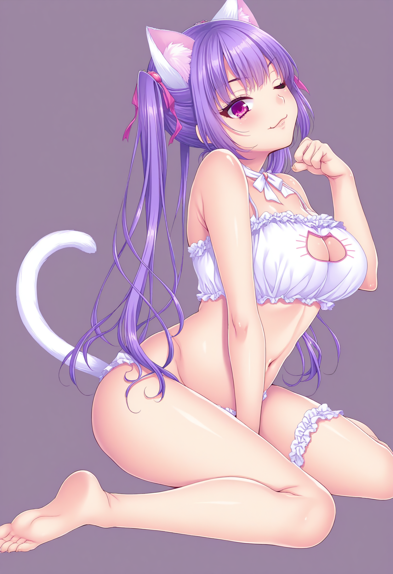 Triggerwords: c-mitsu, pink eyes, purple hair, twintails, hair ribbon, hair ornament, cat ears, cat tail,