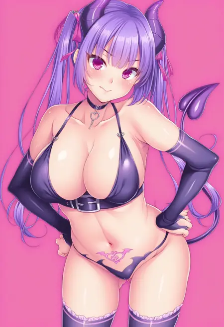 トリガーワード: c-mitsu、ピンクの目、紫の髪、ツインテール、髪飾り、髪リボン、悪魔の角、陰毛タトゥー、悪魔のしっぽ、