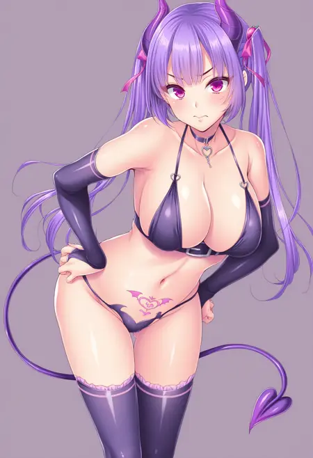 Triggerwords: c-mitsu, pink eyes, purple hair, twintails, hair ribbon, hair ornament, demon horns, pubic tattoo, demon tail,
