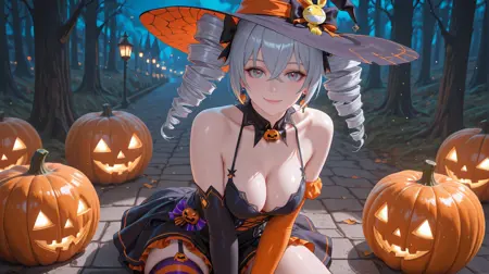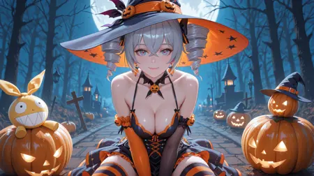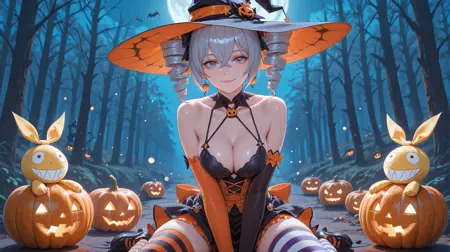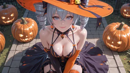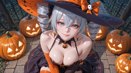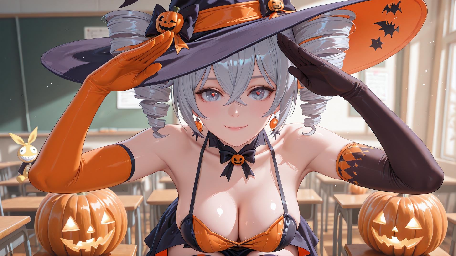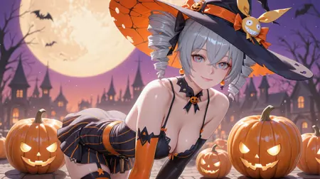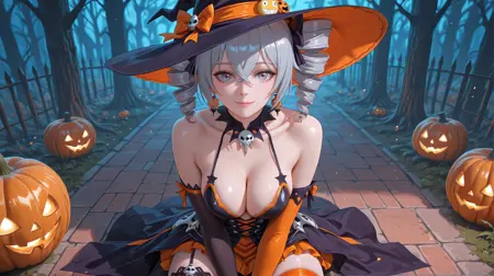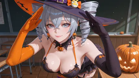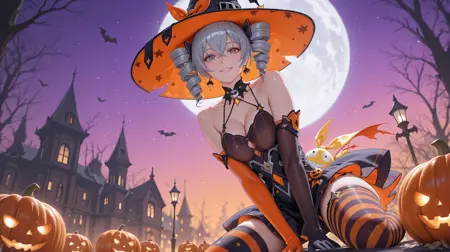 CHAR: Bronya03,bronya zaychik,1girl,solo,grey eyes,gloves,twin drills,drill hair,witch hat,hat,grey hair,asymmetrical gloves,halloween,mismatched gloves,thighhighs,halloween costume,orange gloves,uneven gloves,single thighhigh,homu \(honkai impact\),bare shoulders,elbow gloves,black gloves,dress,earrings,jewelry,witch,pumpkin,hair between eyes,single elbow glove,striped clothes,striped thighhighs